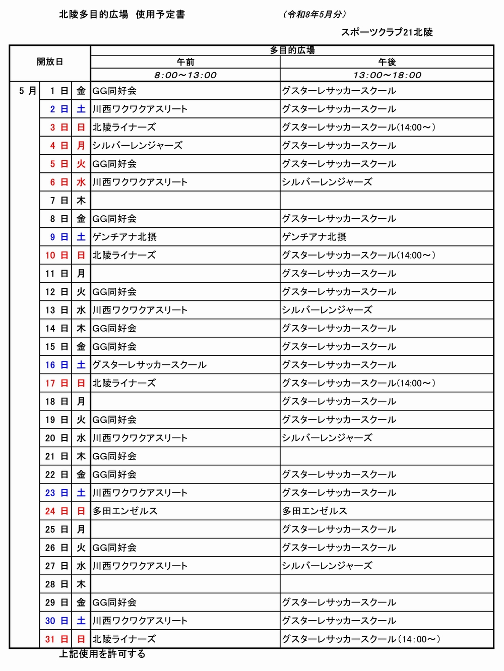 北陵多目的広場開放予定schedule