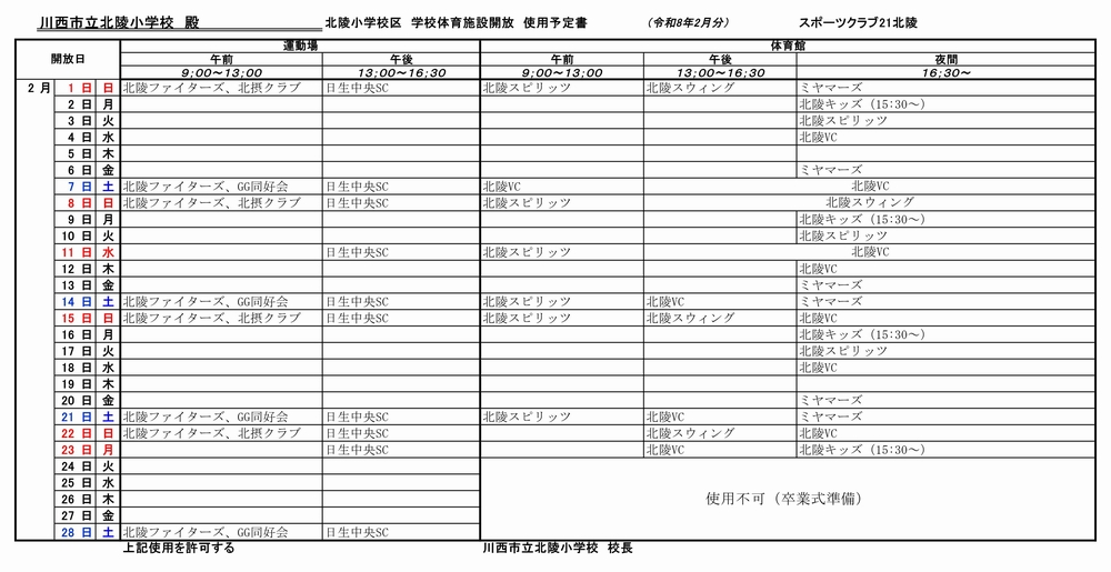 北陵小開放予定schedule