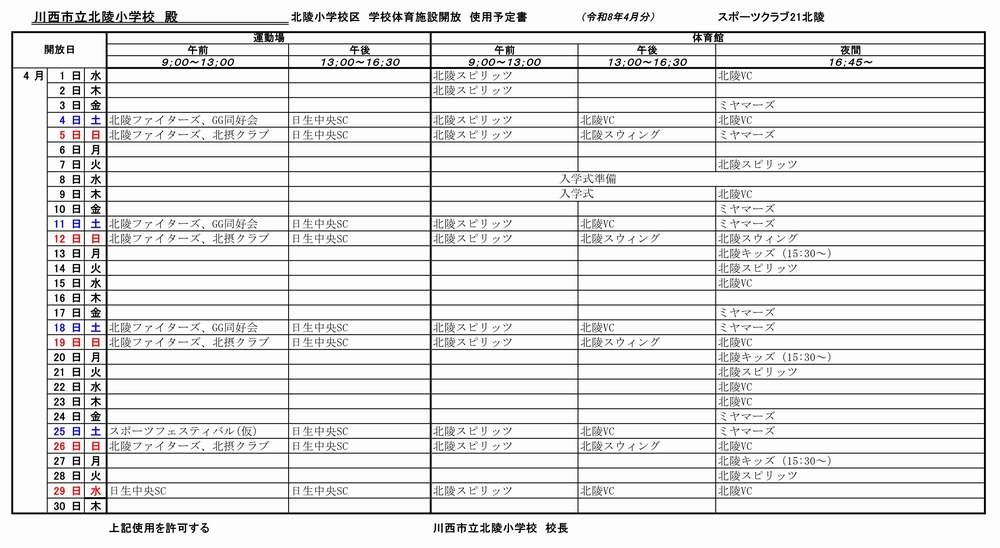 北陵小開放予定schedule